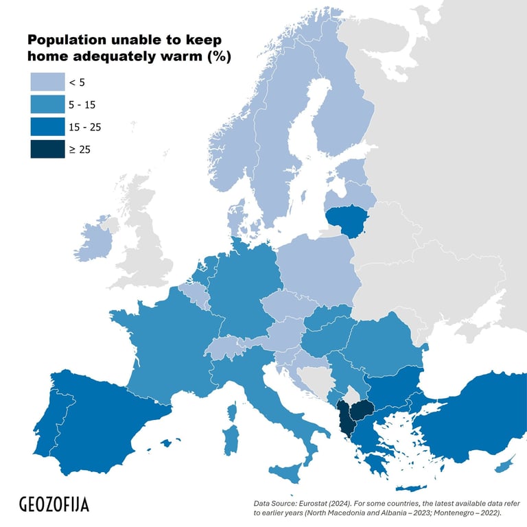 This analysis is based on Eurostat data for 2024 on population figures (DOI: 10.2908/demo_pjan) and on the proportion of the population unable to afford adequate home heating (DOI: 10.2908/sdg_07_60). For North Macedonia and Albania, the most recent available data on this indicator refer to 2023, while for Montenegro the corresponding data pertain to 2022.