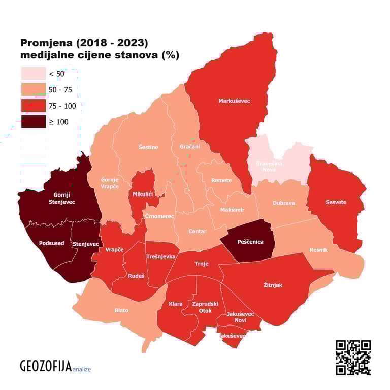 Kada se analizira promjena medijalne cijene (po m² u EUR) stanova u gradu Zagrebu između 2018. i 2023. godine, najveći rast vidljiv je na zapadu grada u katastarskim općinama Podsused, Stenjevec, Gornji Stenjevec te u katastarskoj općini Peščenica na istoku grada - u njima je promjena prelazila 100 %. Povećanje manje od 50 % zabilježeno je samo u jednoj katastarskoj općini - Granešina Nova gdje je došlo do povećanja za 46 %. U većem dijelu grada povećanje se kretalo između 50 i 100 %, dok je nešto izraženije bilo u rubnim dijelovima grada. U većem dijelu Novog Zagreba došlo je do povećanja većeg od 75 % - primjera radi, u katastarskoj općini Zaprudski Otok 2018. godine medijalna cijena kvadratnog metra iznosila je 1182 eura, dok je 2023. godine iznosila 2293 eura - radi se o povećanju za 94 %. Može se zamijetiti kako takvo povećanje cijena topi razlike koje su nekada postojale između različitih dijelova grada te nekada, cjenovno, pristupačniji dijelovi grada postaju sve skuplji.