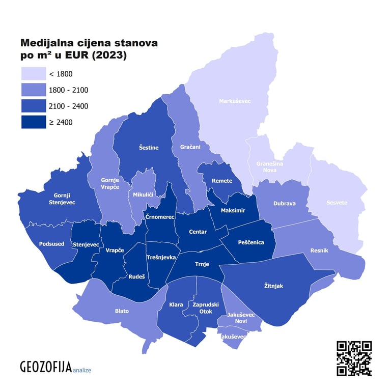 Kada se izdvojeno analizira medijalna cijena stanova (po m² u EUR) u gradu Zagrebu za 2023. godinu, najveće cijene zabilježene su u središnjem dijelu grada (≥ 2400 eura), a posebice u katastarskim općinama Trnje, Centar i Peščenica - gdje je medijalna cijena metra kvadratnog prelazila 2500 eura. Najniže cijene zabilježene su u katastarskim općinama Markuševec, Granešina Nova i Sesvete, u kojima je medijalna cijena bila niža od 1800 eura. Uz navedene katastarske općine, cijenu nižu od 2000 eura imale su samo katastarske općine Gornje Vrapče, Mikulići i Resnik. U najvećem dijelu grada medijalna cijena po metru kvadratnom 2023. godine kretala se između 2000 i 2400 eura.