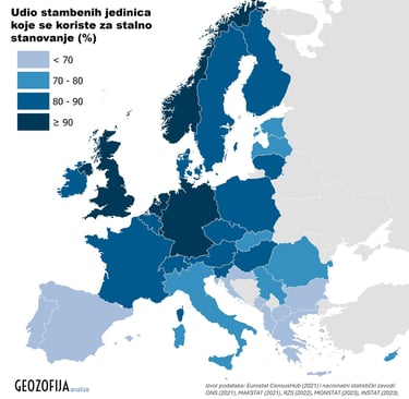 U analizi su korišteni podaci popisa stanovništva iz 2021. godine, preuzeti iz Eurostatove baze The Census Hub, i podaci preuzeti od nacionalnih zavoda za statistiku, za države koje nisu uvrštene u Eurostatovu bazu podataka – Ured za nacionalnu statistiku Ujedinjenog Kraljevstva (2021), Državni zavod za statistiku Republike Sjeverne Makedonije (2021), Republički zavod za statistiku Republike Srbije (2022), Zavod za statistiku Crne Gore (2023) i Institut za statistiku Albanije (2023). U Srbiji se popis održao 2022. te u Crnoj Gori i Albaniji 2023. godine. Eurostat nastanjene stambene jedinice definira kao one stambene jedinice koje su u vrijeme popisa korištene kao uobičajeno mjesto stanovanja jedne ili više osoba. Više o Eurostatovoj metodologiji možete saznati na linku.