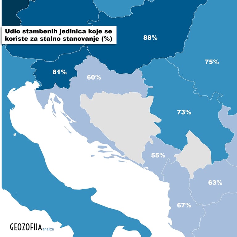 U Hrvatskoj se samo 60% stambenog fonda koristi za stalno stanovanje, dok preostali dio stambenog fonda uglavnom čine prazni stanovi (25%) i stanovi za odmor (10%). Situacija je još nepovoljnija u Crnoj Gori gdje se 55% stambenog fonda koristi za stanovanje, a stanovi za sezonsko korištenje (vikendice) čine čak 23% fonda. U Sjevernoj Makedoniji se za stanovanje koristi 63% stambenog fonda, u Albaniji 67%, dok je nešto povoljnija situacija u Srbiji gdje se za stalno stanovanje koristi 73% stambenog fonda. U jugoistočnoj Europi zabilježeni su i slučajevi pranja novca kroz tržište nekretnina, što također doprinosi manjim udjelima stanova koji se koriste za stanovanje, odnosno većim udjelima praznih i tek povremeno korištenih stanova.