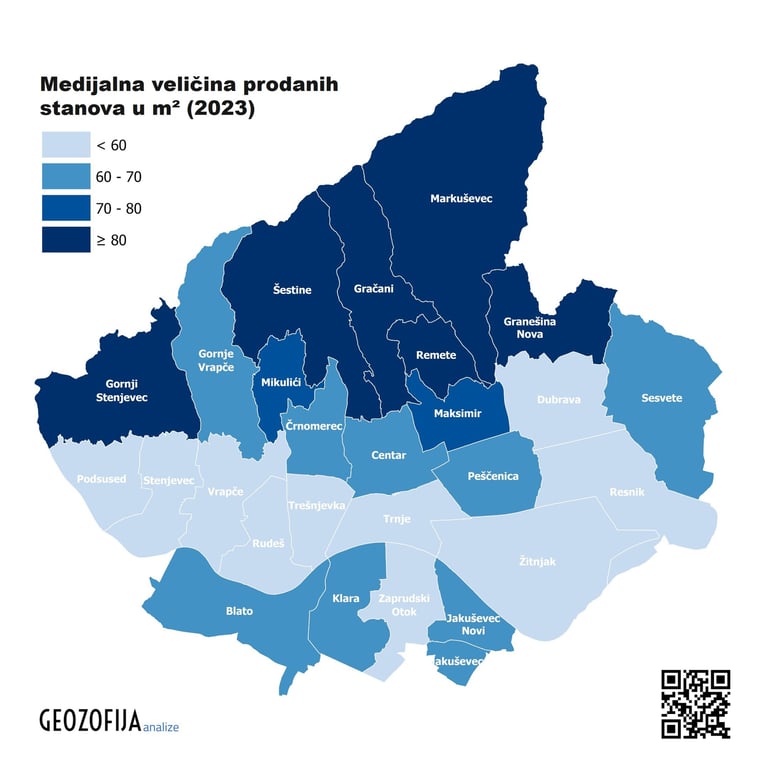 Medijalna veličina prodanih stanova u gradu Zagrebu 2023. godine varirala je između 50 i 100 metara kvadratnih. U većem dijelu grada Zagreba medijalna veličina kretala se između 50 i 70 kvadrata, radi se o rasponu veličina koje su na tržištu ujedno i najtraženije. Nešto veću medijalnu veličinu prodanih stanova (između 70 i 80 metara kvadratnih) imale su katastarske općine Maksimir i Mikulići. Najveću veličinu imale su katastarske općine Šestine i Granešina Nova u kojima je medijalna veličina prodanih stanova prelazila 100 kvadrata. Uz njih, najveću medijalnu veličinu prodanih stanova (≥ 80) imale su katastarske općine Gornji Stenjevec i Remete, kao i katastarske općine koje su dio podsljemenske zone. Najmanju medijalnu veličinu prodanih stanova imale su katastarske općine Trešnjevka i Zaprudski Otok, manje od 55 kvadrata.