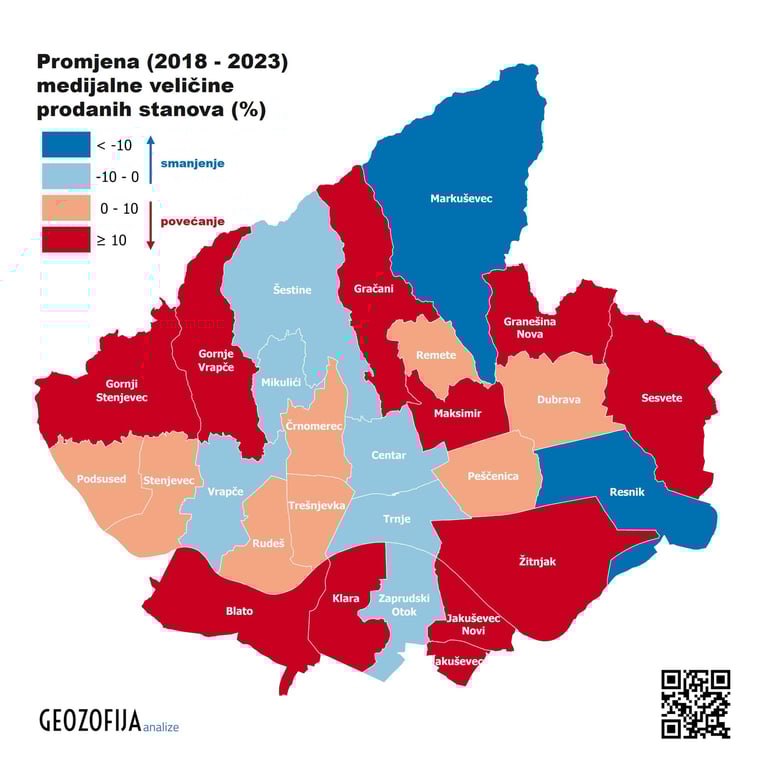 Kada se analizira promjena medijalne veličine prodanih stanova između 2018. i 2023. godine, uočava se kako je u većem dijelu grada došlo do povećanja ili smanjenja medijalne veličine do 10 % - taj postotak pretvoren u kvadratne metre uglavnom donosi tek nekoliko kvadrata razlike. Primjera radi, u katastarskoj općini Zaprudski Otok došlo je do smanjenja za 6 %, medijalna veličina 2018. godine iznosila je 55,1 m² dok je 2023. godine iznosila 51,8 m² - radi se o razlici od 3,3 kvadrata. Zamjetno je kako na rubovima grada dolazi do nešto zamjetnijeg povećanja medijalne veličine, povećanje veće od 10 %. Najveće smanjenje imala je katastarska općina Markuševec gdje je došlo do smanjenja za 23 %, dok je s druge strane najveće povećanje imala susjedna općina Granešina Nova gdje je došlo do povećanja za 25 %.