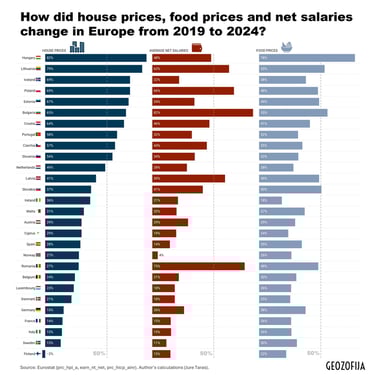 This analysis compares how much housing and food prices have increased relative to the growth of average net salaries over a five-year period, from the pre-pandemic year of 2019 to 2024. Housing and food represent basic living necessities, yet in recent years, rising prices in these categories have not been matched by comparable growth in average salaries.
